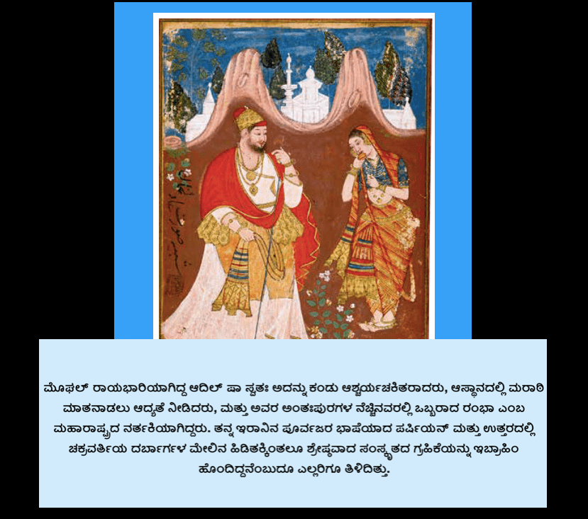 ಕೃತಕ ಬುದ್ಧಿಮತ್ತೆ ನಮಗೆ ಸರಿಯಾಗಿ ಮಾರ್ಗದರ್ಶನ ನೀಡುತ್ತದೆ ಎಂದು ನಾವು ಶೇಕಡಾ ನೂರರಷ್ಟು ಖಚಿತವಾಗಿ ಹೇಳಲು ಸಾಧ್ಯವಿಲ್ಲ. ಸುಲ್ತಾನ್ ಇಬ್ರಾಹಿಂ ಆದಿಲ್ ಷಾ ತನ್ನ ಅಂತಃಪುರದಲ್ಲಿ ಒಂದು ನೃತ್ಯವನ್ನು ಕಂಡುಕೊಂಡಿದ್ದನೆಂದು AI ನಮಗೆ ಹೇಳುತ್ತದೆ. 5. ಮಹಾರಾಷ್ಟ್ರದಿಂದ ಬಂದವರು ಮತ್ತು ಮರಾಠರಿಂದ ಬಂದವರಾಗಿರಬಹುದು ಎಂದು ಭಾವಿಸಲಾಗಿದೆ. ವಿಚಿತ್ರವೆಂದರೆ, ದಂಪತಿಗಳ ಪ್ರಾಚೀನ ವರ್ಣಚಿತ್ರದಿಂದ ಆಸ್ಥಾನದ ನೃತ್ಯಗಳನ್ನು ತೆಗೆದುಹಾಕಲಾಯಿತು. ಆಕೆ ಮರಾಠ ಸಂಪ್ರದಾಯ 6ರ ಉಡುಪನ್ನು ಧರಿಸಿದ್ದಳು. ನಂತರದ ಸುಲ್ತಾನರು ಕಥೆಯನ್ನು ಬದಲಾಯಿಸಿದರೇ? ಮತ್ತು ಹಾಗಿದ್ದರೆ, ಅದು ಏನು? ಇಬ್ರಾಹಿಮ್ ಶೂದ್ರ ಎಂದು ಪರಿಗಣಿಸಲಾದ ಹುಡುಗಿಯನ್ನು ಪ್ರೀತಿಸಿ, ಅವಳನ್ನು ತನ್ನ ಪ್ರೇಯಸಿಯಾಗಿ ಮಾಡಿಕೊಂಡಿದ್ದರೆ, ಅದು ತುಂಬಾ ಅನುಚಿತವಾಗಿರುತ್ತಿತ್ತು. ಇಬ್ರಾಹಿಂ ಅವರನ್ನು ಅವರ ಸಮುದಾಯವು ಮೃದು ಧರ್ಮದ್ರೋಹಿ ಎಂದು ಪರಿಗಣಿಸಿತ್ತು. ದುರ್ಬಲ ಸಾಕಷ್ಟು. ಮತ್ತೆ AI ಅನ್ನು ಉಲ್ಲೇಖಿಸಲುಃ ಇಬ್ರಾಹಿಂ ತನ್ನ ಆಸ್ಥಾನದಲ್ಲಿ ಪಕ್ಷಗಳಿಗೆ ಅಂಚಿನಲ್ಲಿರುವ ವರ್ಗದ ಜನರನ್ನು ಕರೆತಂದನು 7ರಷ್ಟಿದೆ. ಇಂದು ಬಿಜಾಪುರದ ಅಧಿಕೃತ ಕಥೆಯೆಂದರೆ, ರಂಭಾ ಆದಿಲ್ ಶಾಹಿ ರಾಜವಂಶದ 7ನೇ ದೊರೆ ಮುಹಮ್ಮದ್ ಆದಿಲ್ ಷಾನ ಪ್ರೇಯಸಿಯಾಗಿದ್ದಳು. ಗೋಲ್ ಗುಂಬಜ್ನಲ್ಲಿನ ಮಾರ್ಗದರ್ಶಿಗಳು ರಂಭಾ ಶ್ರೀಲಂಕಾದ ನೊಬೆಲ್ ನರ್ತಕಿಯಾಗಿದ್ದಳು ಎಂದು ನಿಮಗೆ ತಿಳಿಸುತ್ತಾರೆ, ಅವಳನ್ನು ಗೋಲ್ ಗುಂಬಜ್ನ ಸಮಾಧಿಯೊಳಗೆ ಸುಲ್ತಾನ್ ಮತ್ತು ಅವನ ಹೆಂಡತಿಯ ಪಕ್ಕದಲ್ಲಿ ಸಮಾಧಿ ಮಾಡಲಾಗಿದೆ.