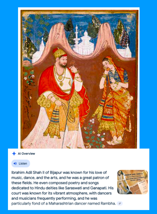 We can not be hundred per cent sure that Artificial Intelligence will guide us correctly. AI tells us that Sultan Ibrahim Adill Shah was very found of a dancers in his harem. One of them supposed to have come from Maharashtra 5., and could have been a captive from the Marathas. Strangely enough, this court dancer was removed from an ancient painting of the couple. She dressed up in a Maratha custom 6. Did the later Sultans change the story? And if so, why? If Ibrahim had fallen in love with a girl considered a sudra, and made her his mistress, it would have been very improper. Ibrahim was also considered a soft heretic, by his community. A weak suffi. Again to quote AI: Ibrahim brought in marginalized class of people to the parties in his court 7. The official story in Bijapur today, is that Rambha was the mistress of Muhammad Adill Shah, the 7th ruler of the Adill Shah dynasty. The guides at Gol Gumbaz will tell you that Rambha was a noble dancer from Sri Lanka, she is laid to rest next to the Sultan and his wife inside the tomb of Gol Gumbaz 8.